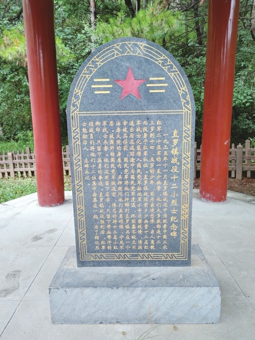 直罗烈士陵园位于陕西省延安市富县直罗镇直罗街宝塔山下,主要安葬的是红军长征途中在直罗镇战役中牺牲的革命烈士。走进烈士陵园,首先映入眼帘的是一座静静伫立于苍松翠柏之间的20余米高的纪念碑。1985年8月,时任中央军委副主席的杨尚昆为纪念碑题词——直罗战役烈士纪念碑。陵园内建有纪念馆、革命英烈墙、长征精神纪念碑等建筑。英烈区埋葬着此役阵亡的648人,其中有630位是无名烈士。拾级而上,在山腰一侧,可以醒目地看到十二小烈士纪念亭,亭内竖立着高约两米多的那座让所有瞻仰者动容落泪的直罗镇战役十二小烈士纪念碑。经过党史专家的多方考证,这些小战士牺牲时,都没有留下名字和任何影像资料。雕刻着红五星的纪念碑,向后来者述说着那段悲壮的革命故事。碑文内容如下: