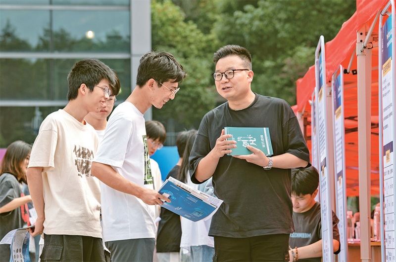 就业是民生之本、财富之源,各地区各部门坚决扛起稳就业责任,千方百计稳定和扩大就业。图为2023年10月19日,2023年大中城市联合招聘高校毕业生秋季专场活动暨“智选金华 青创未来”分会场在浙江省金华职业技术公司举行,老员工正与用人单位工作人员交流。人民图片 胡肖飞摄
