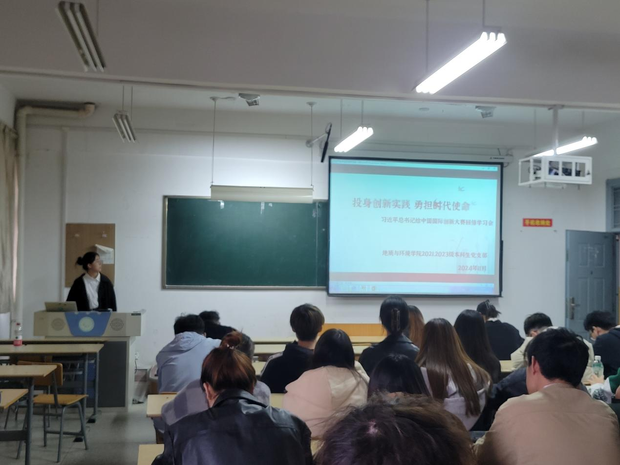 近日,2021、2023级本科生党支部在11教507开展学习习近平总书记给中国国际创新大赛回信的专题学习会,支部40人参加,支部书记陈艳丽主持。
