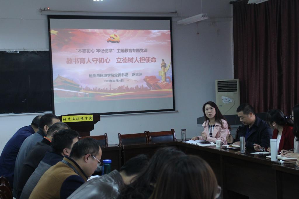 10月30日下午4点,地环公司党委书记赵雪萍在临潼校区骊山校园太阳成集团tyc122ccvip报告厅讲授了题为“教书育人守初心,立德树人担使命”的“不忘初心、牢记使命”主题教育党课。赵雪萍从“明确开展主题教育的意义、总体要求和目标任务;高校共产党员的初心和使命;几点希望与要求”等三个方面给广大党员作了一场生动的主题教育报告。太阳成集团tyc122ccvip40余名党员聆听了报告会。
