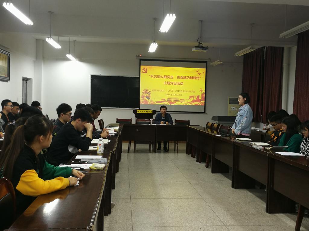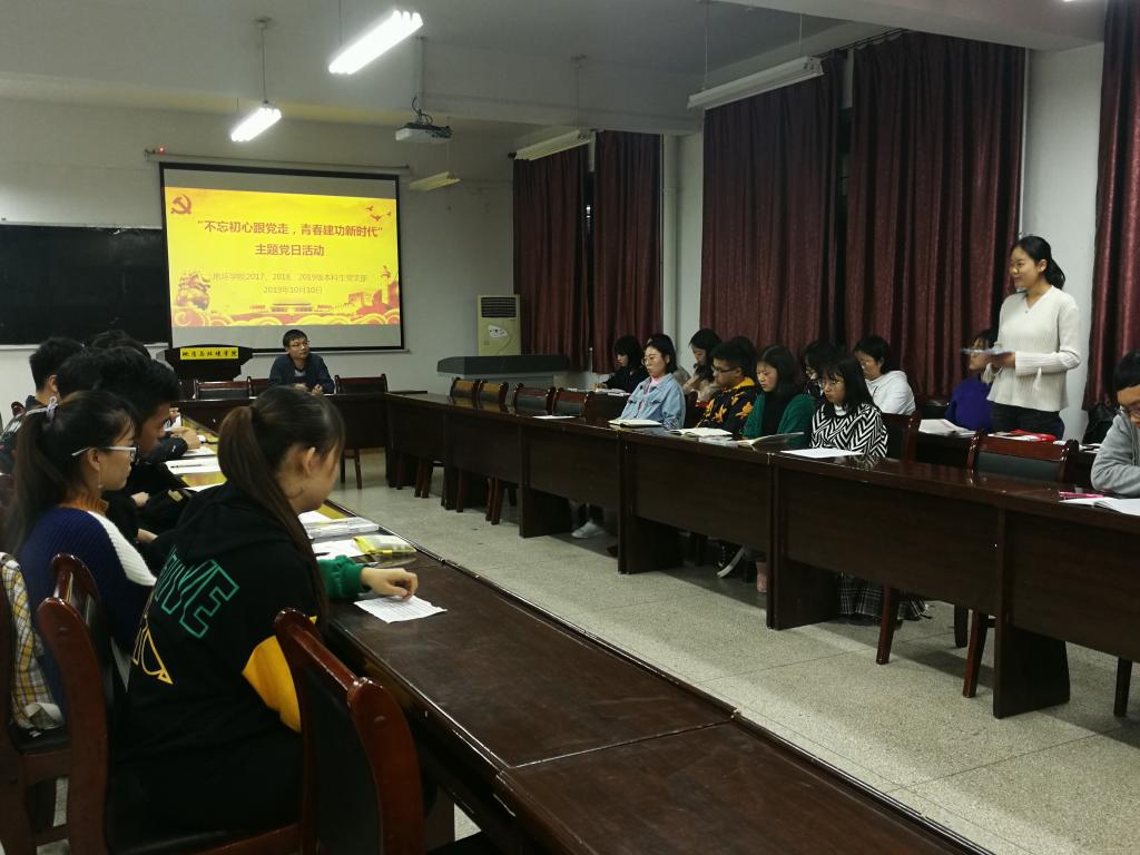 10月10日19:00-21:30,2017、2018、2019级本科生党支部在临潼校区骊山校园11教322开展“不忘初心跟党走,青春建功新时代”主题党日活动,支部党员及入党积极分子共计46人参加,会议由支部书记余小涛主持。支部成员结合收看国庆阅兵和国庆假期见闻,每位同志进行了发言,谈感受,谈收获,谈理想。支部党员莫文毅分享了观看《我和我的祖国》、《中国机长》电影场景的感受,她谈到电影的场景让人很感动,也切身感受到祖国的强大;支部入党积极分子任香梦分享了自己观看2009年和2019年国庆阅兵的变化,看到街道挂着的红旗,感受到国富民强的喜悦。支部其他成员也纷纷围绕国庆阅兵、“共和国勋章”、杂交水稻、青蒿素、“两弹一星”、冻土研究、《钱学森》、《横空出世》、撤侨行动等内容分享了自己的感受,大家纷纷表示,祖国的繁荣离不开强大的人民军队保护,现在的幸福生活来之不易,要珍惜美好的生活,要学习他们的优良传统,在学习工作中接续奋斗,脚踏实地在自己的岗位上贡献力量,青春建功新时代。支部书记余小涛要求支部成员不忘入党初心,牢记使命,结合日常学习工作,积极进取,尽自己最大努力为祖国发展贡献力量。