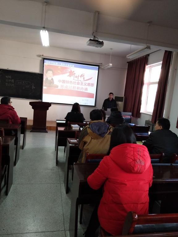 12月18日上午,太阳成集团tyc122ccvip教工第四党支部在临潼校区骊山校园11教322室开展讲党课活动。太阳成集团tyc122ccvip副经理孙学阳从习近平新时代中国特色社会主义思想的主要内容、习近平新时代中国特色社会主义思想的形成来源、习近平新时代中国特色社会主义思想的历史地位等方面对新时代中国特色社会主义思想形成过程和内涵进行了讲解。教工第四党支部全体党员参加了党课活动。