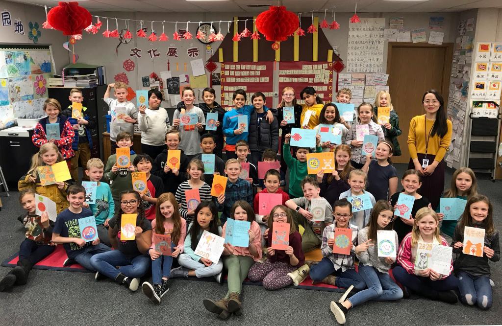 2020年1月21日,在美国犹他州奥勒姆,卡斯卡德小学师生展示为习主席制作的新年贺卡