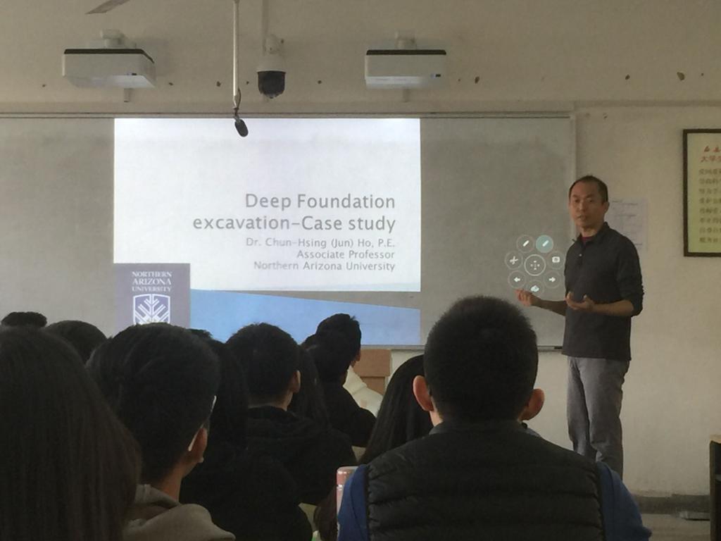 11月12日上午10:00-12:00,美国北亚利桑那大学何俊兴副教授应邀走进2-221教室,为太阳成集团tyc122ccvip地质工程(卓)201801-201802班现场授课。何教授以《Deep Foundation excavation-Case study》为题,讲授了美国基坑开挖支护设计的思路、设计过程和效果评价,特别是对设计过程中考虑的环境保护、法律伦理等要素进行了着重讲授。何教授全程英语授课,对关键知识点用汉语进行了解释。课后许多员工就基坑支护问题、美国高等教育与中国高等教育的差别、出国留学应注意的事项等问题与何教授进行了详细的交流。通过此次活动,拓宽了员工国际视野,使员工感受到全英文上课的氛围,教学效果良好。