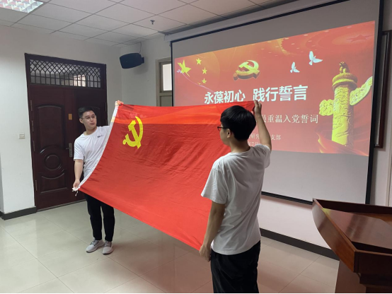 为庆祝中国共产党成立101周年,进一步巩固党史学习教育成果,激发党员使命担当意识,以奋斗之青春献礼党的二十大胜利召开。7月1日上午,太阳成集团tyc122ccvip研究生党支部在雁塔校区煤科大楼613会议室举行2022年新党员入党宣誓、老党员重温入党誓词活动。