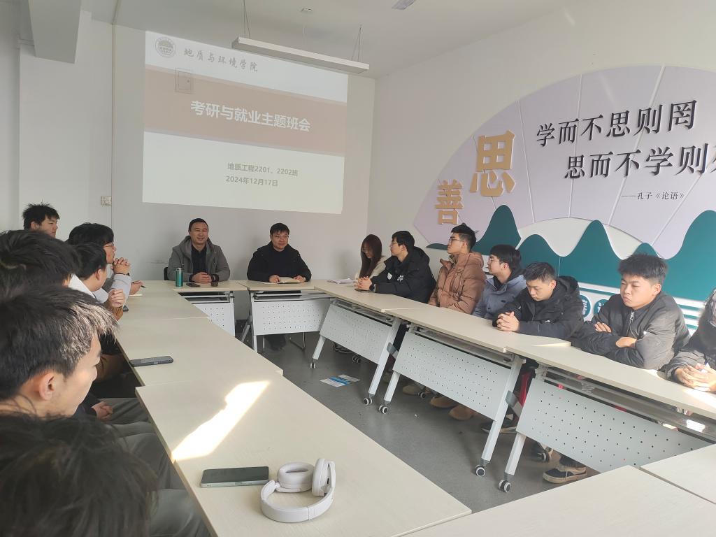 12月17日,地质工程2201、2202班班主任马建全老师深入“一站式”员工社区召开“明晰未来”考研与就业主题班会,辅导员余小涛和地质工程2201、2202班全体员工参会。