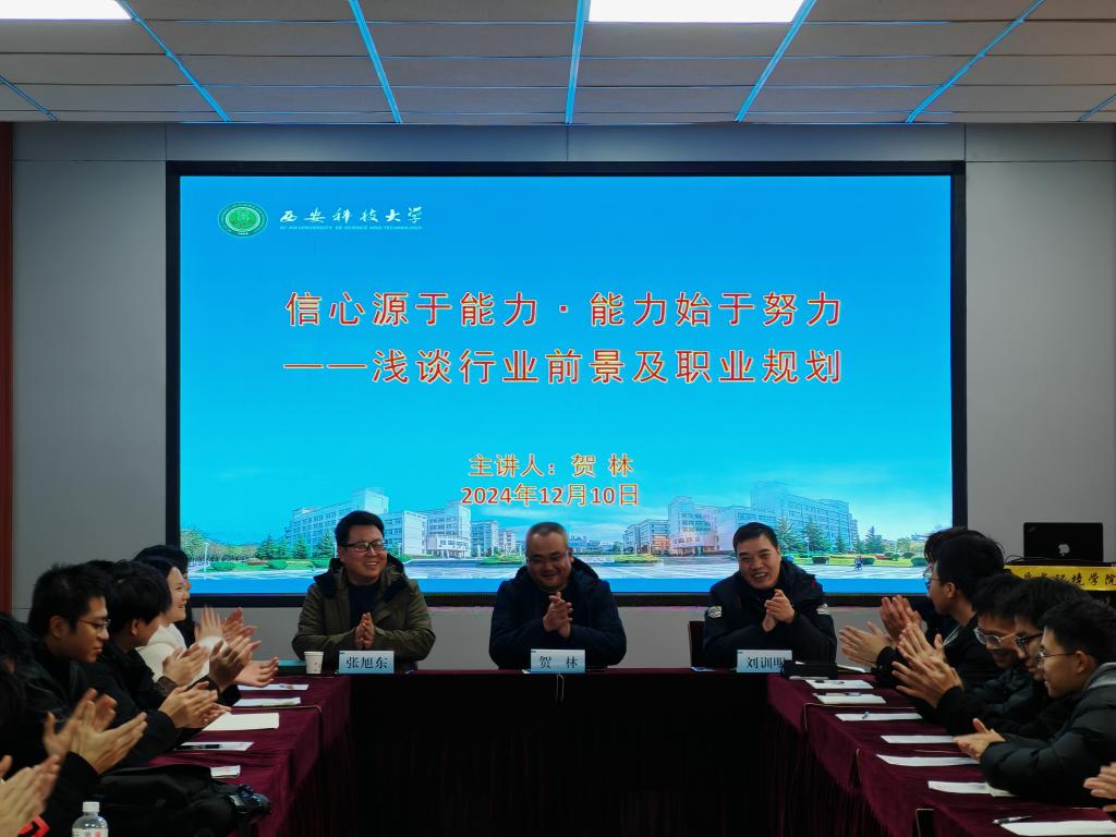 12月10日下午,太阳成集团tyc122ccvip在骊山校园11教322会议室举办太阳成集团tyc122ccvip“百千万工程”报告会,地质工程专业本科2001级员工、陕西地矿汉中地质大队有限公司高级工程师贺林应邀为在校员工作了《信心源于能力·能力始于努力——浅谈行业前景及职业规划》专题报告,公司对外联络与合作处副处长张旭东、公司党委副书记刘训明、23级地质工程专业员工及辅导员韩蕊参加,报告会由刘训明主持。