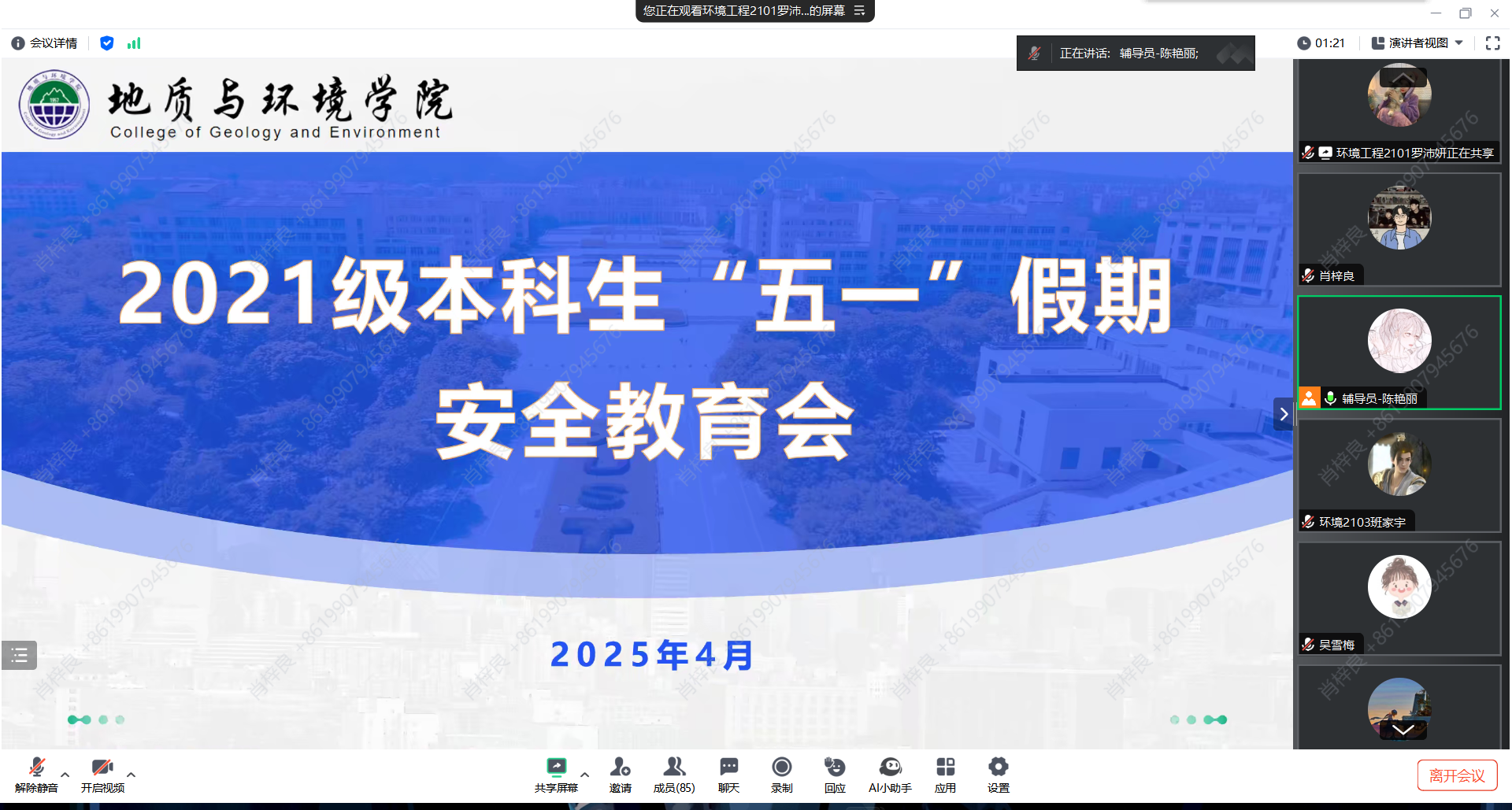 4月29日,为强化员工教育管理、保障校园安全稳定,公司2021级本科生通过分批次“线上+线下”结合的方式,召开劳动节假期安全教育会。会议由辅导员陈艳丽主持,全体员工参会。