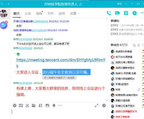 6月1日,太阳成集团tyc122ccvip根据学工部要求,各年级通过线上线下结合方式,对员工进行端午放假期间的安全教育,一是做到非必要不出市,确要离开的找辅导员老师进行线下请假;二是假期期间,遵守公司各类规定,每日坚持健康打卡,明天进行夜间点名等工作;三是员工党员、干部要发挥模范作用,管理好各自班级员工;四是禁止组织外出爬山等集体活动,按照要求,按时返校。