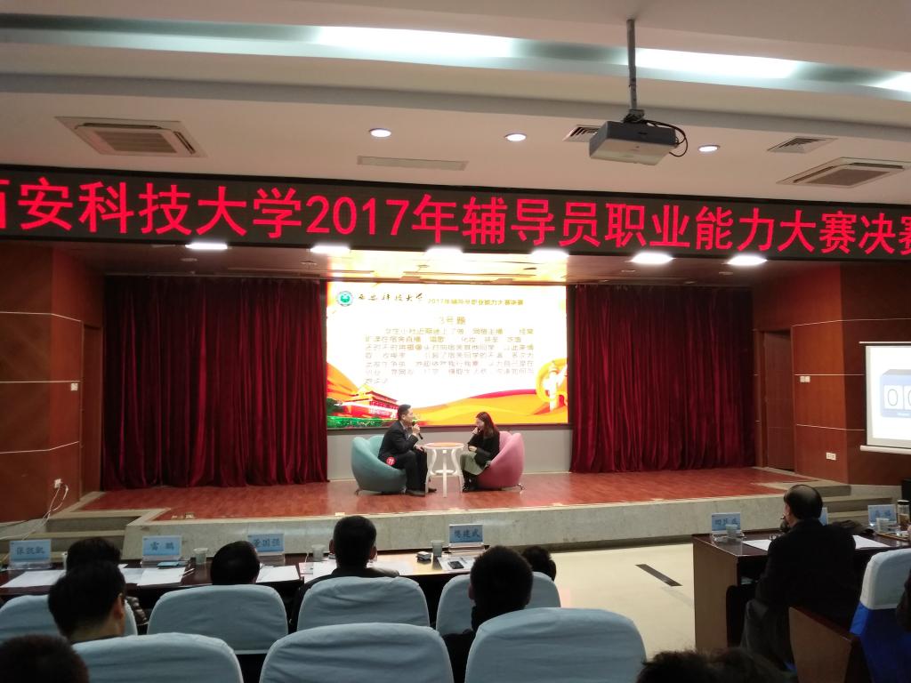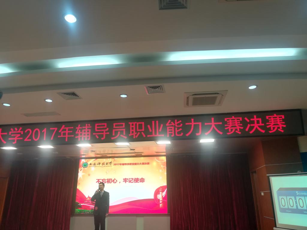 12月28日下午,太阳成集团tyc122ccvip2017年辅导员职业能力大赛决赛在临潼校区骊山校园图书馆报告厅举行。经过前期笔试、案例分析、主题班会、主题演讲等环节,公司辅导员林伟进入决赛谈心谈话环节,经过激烈角逐,辅导员林伟荣获公司2017年辅导员职业能力大赛二等奖和谈心谈话环节单项奖。另外,公司辅导员汪莹荣获公司2017年辅导员职业能力大赛优秀奖。
