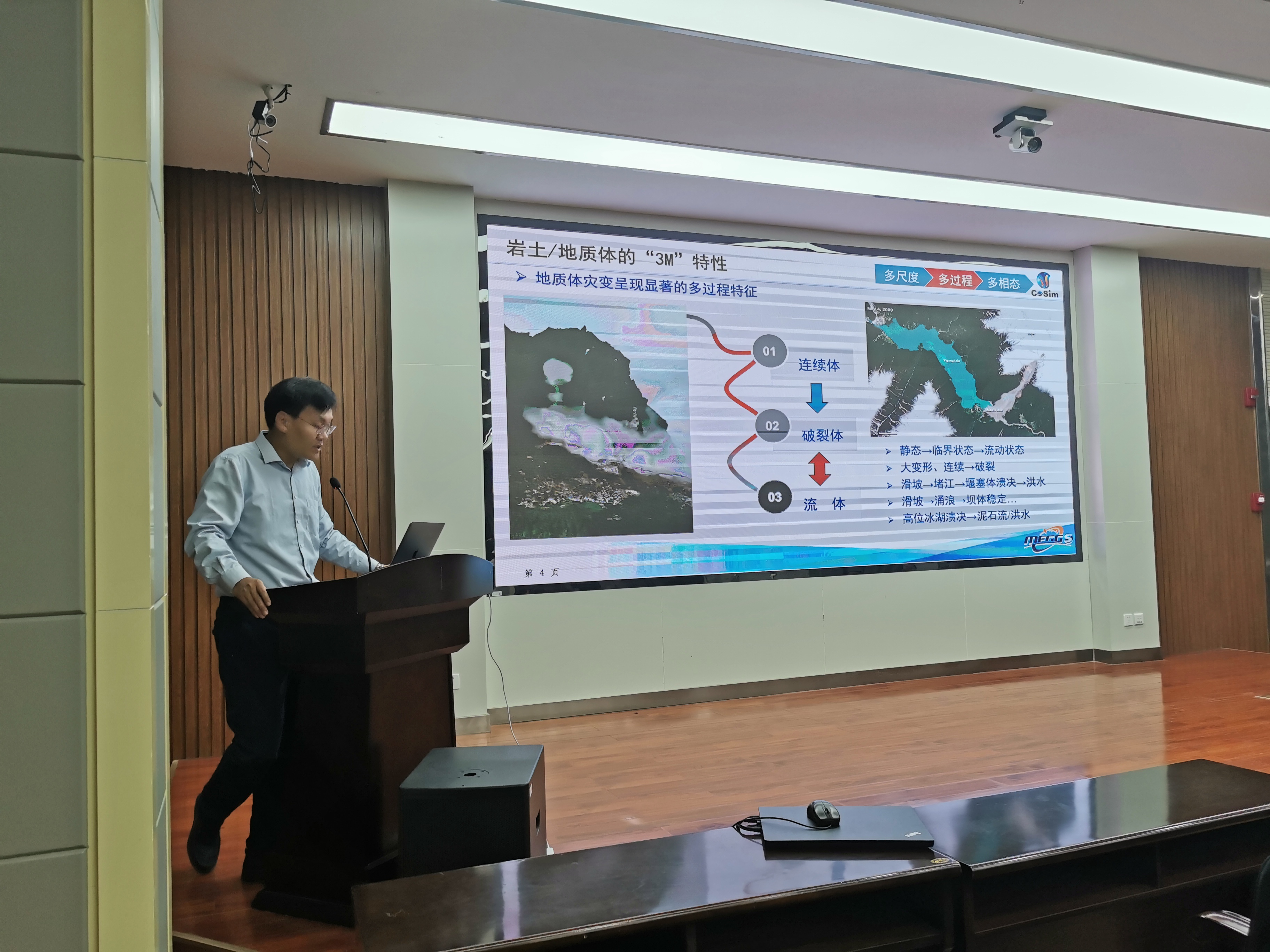 在报告中,徐文杰老师以地质/岩土灾害多尺度、多过程及多相态(“3M”)特征及我国在岩土与灾害领域数值计算方面存在的卡脖子技术为背景,详细介绍了自主研发的耦合模拟-CoSim系统及系统不同功能模块的物理力学机制,对地质/岩土灾害中的细观-宏观力学、连续体-非连续体、连续破裂、流动、流体-固体耦合等科学与工程问题的解决方案进行了示例,并对重大地质灾害链生动力学全过程分析解决方案进行了探讨。报告结束后,徐文杰老师与相关教师、研究生进行了深入交流和讨论。本次论坛活动增加了同学们对相关领域的关注与研究热情,也为部分师生从事岩土与灾害领域科学计算与模拟研究提供了有益的借鉴与启发。
