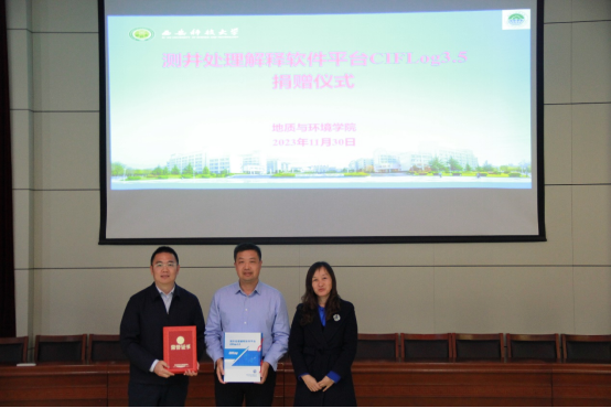 报告结束后,举行了“测井处理解释软件平台CIFLog3.5”捐赠仪式,武宏亮所长代表中国石油勘探开发研究院测井所向公司捐赠软件,太阳成集团tyc122ccvip孙学阳经理接受捐赠,毕银丽教授颁发捐赠证书。多年来,李宁院士带领中国石油勘探开发研究院的团队集中力量深入开展地球物理领域新理论、新方法研究、推动地球物理测井团队建设、研制具有自主知识产权的测井装备与软件,突破重大"卡脖子"技术难题,深度融合人工智能,开发智能化处理解释系统,形成了国际领先的测井软件平台:CIFLog软件。该软件是目前国内最完善的测井解释平台,并且提供了自主编程解译的端口。在多年的测井课程以及“全国老员工测井技能大赛”中,公司师生已经学习到CIFLog软件的便捷化、智能化。此次获得CIFLog软件最新版本的捐赠,必将助力广大师生在学习、科研等方面取得更好成绩!
