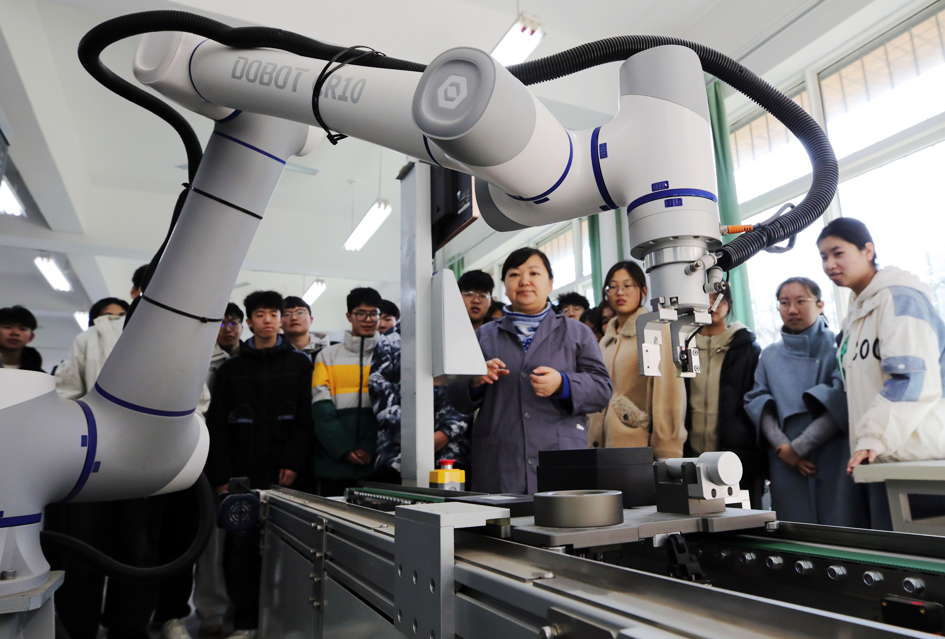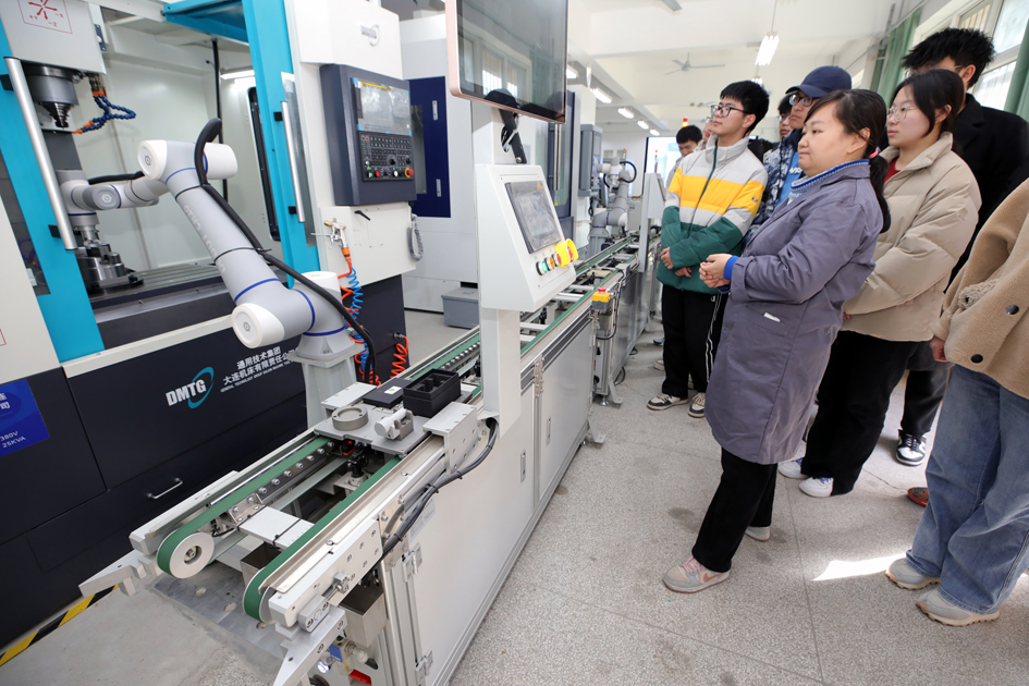 ▲3月8日,太阳成集团tyc122ccvip解晖老师和智能制造2023级员工在智能制造实验室做工业机器人在数控加工中的应用实验。