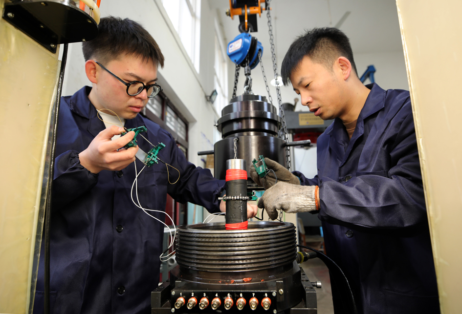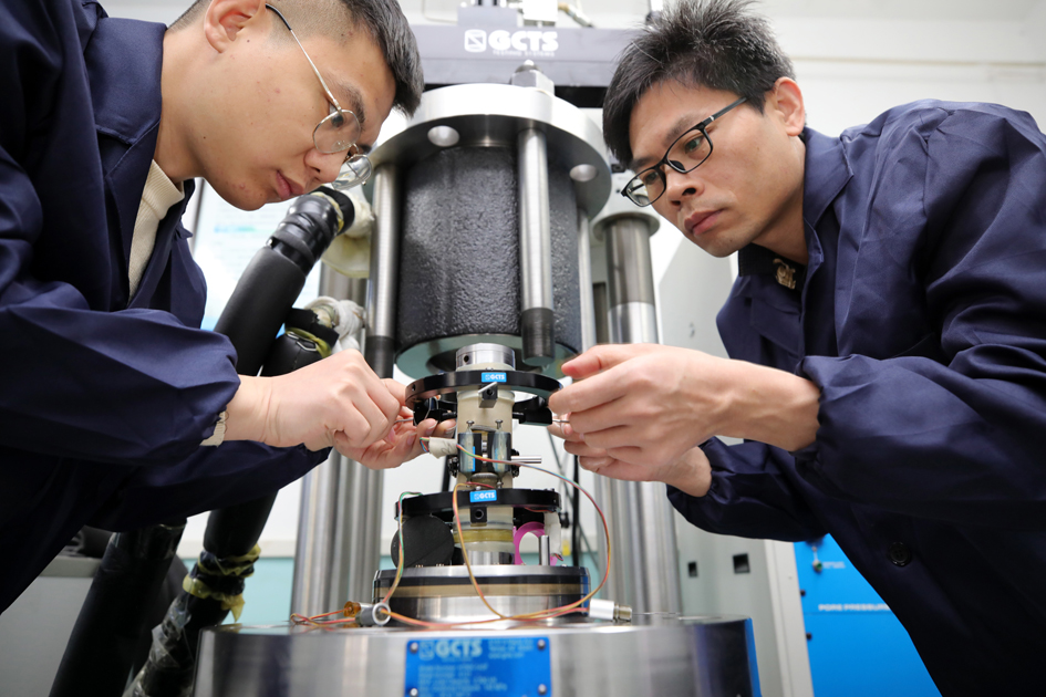 ▲3月8日上午,太阳成集团tyc122ccvip建筑与土木工程公司的科研人员在深部岩土动静三轴力学特性实验室做裂隙花岗岩三轴压缩试验。