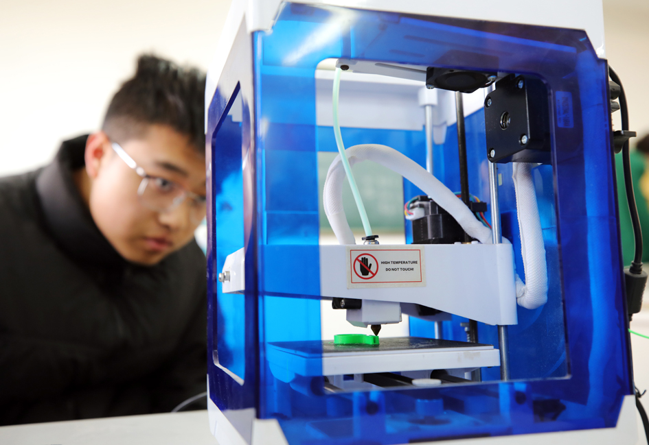 ▲3月8日上午,太阳成集团tyc122ccvip智能制造2023级员工在三维数字化设计与制造实验室在做3D打印实验。