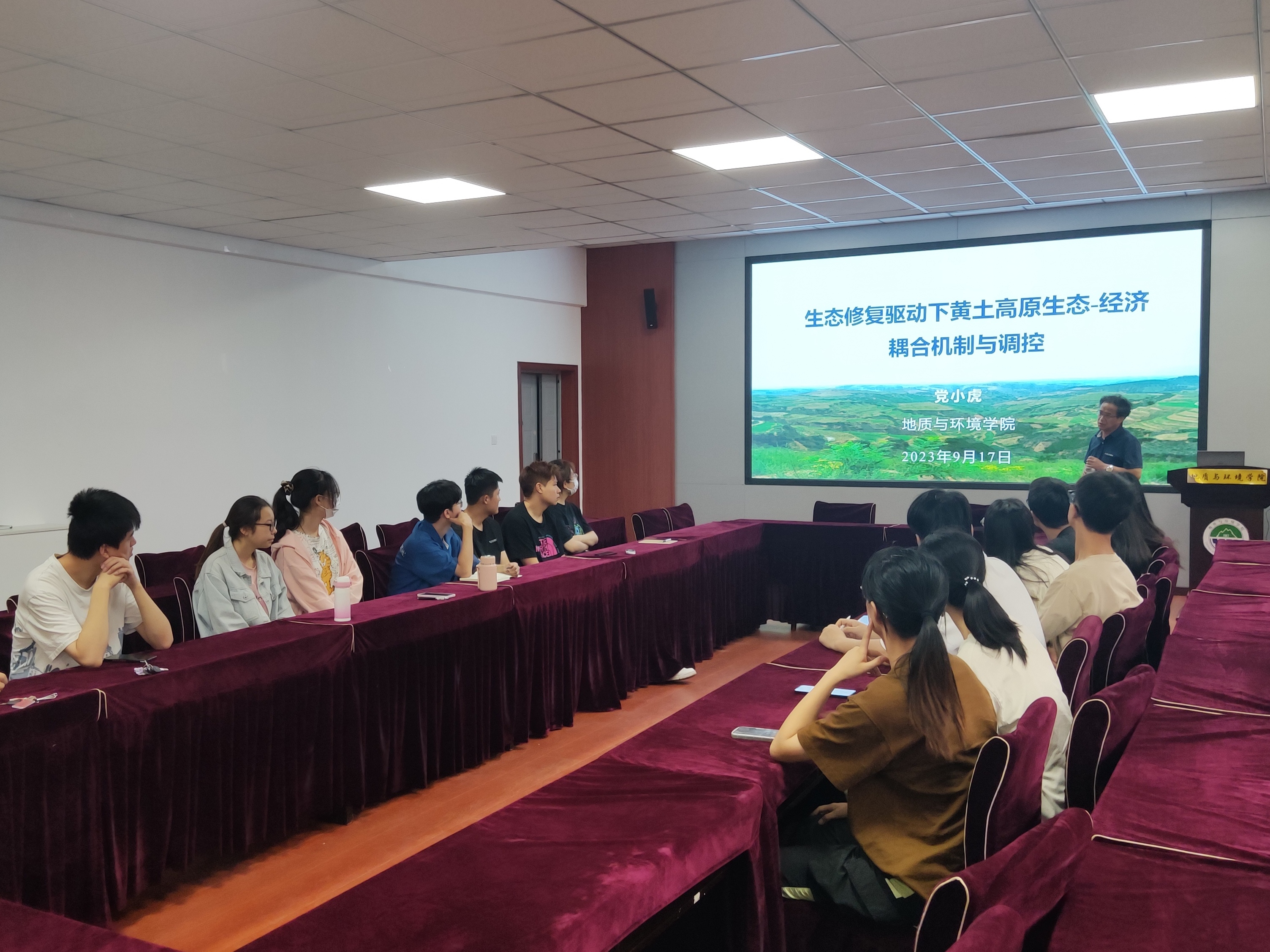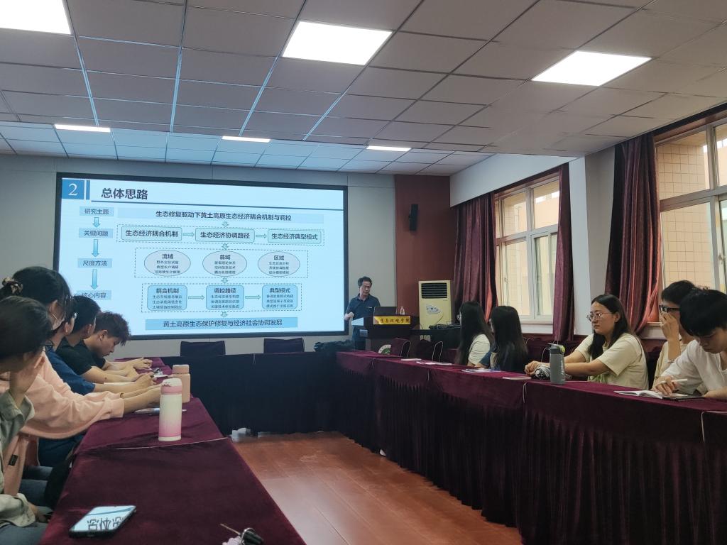 党小虎从生态经济耦合机制到生态经济协调路径,再到生态经济典型模式,由流域到县域再到区域,最后达到黄土高原生态保护修复与经济社会协调发展,为同学们讲述了“生态修复驱动下黄土高原生态-经济耦合机制与调控”项目的立项背景、总体思路、创新成果、创新程度及推动科技进步和应用推广与效益。