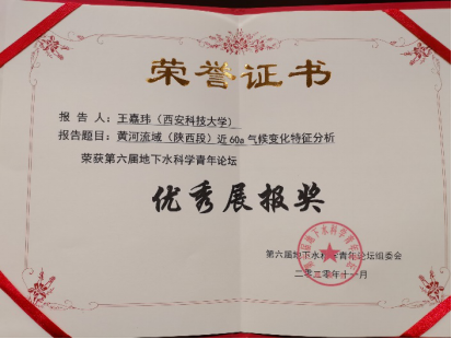 公司2020级研究生王嘉玮参加于2020年11月在四川成都举行的第六届地下水科学青年论坛并荣获优秀展板奖。