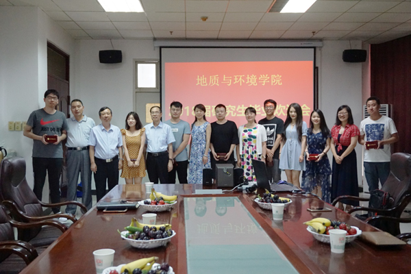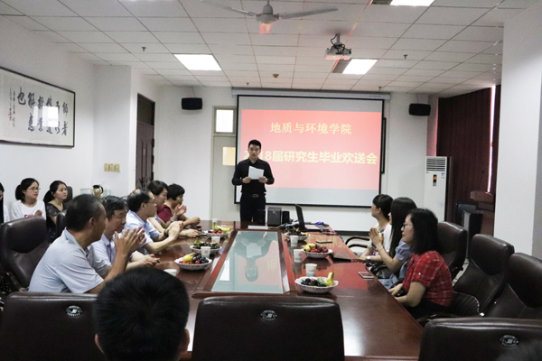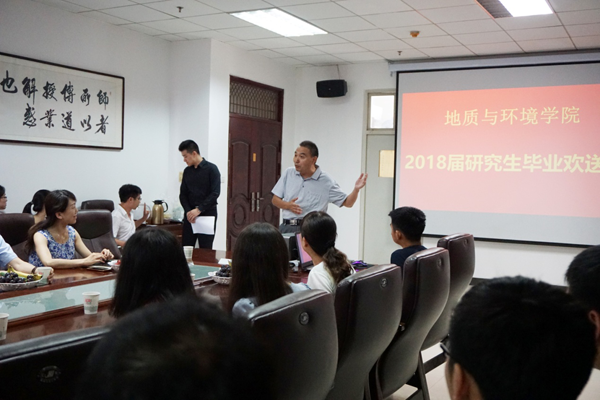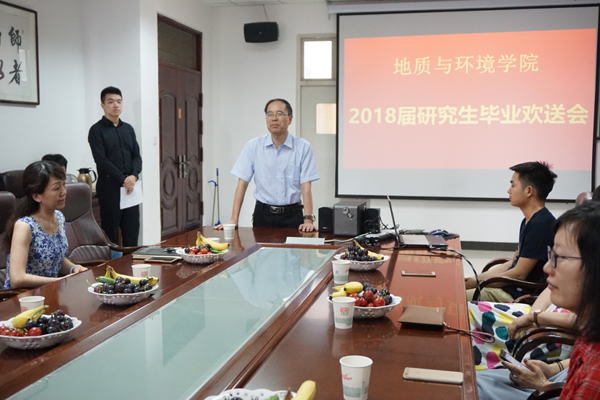 6月29日下午,地质与环境公司在雁塔校区行政楼613举办了2018届研究生毕业欢送会。公司党政领导、教师代表及2018届全体研究生参加了欢送会。毕业生代表地质工程硕士陈达、在职工程李小雪代表同学回顾了三年的公司生活并对公司及老师的培养表达了感谢;薛喜成教授代表教师祝贺同学们顺利毕业并提出了殷切希望;经理王生全为毕业生送上祝福:“愿大家顺利启航,不断学习,严谨工作,享受生活,也希望大家变成更好的自己。”随后,公司颁发了优秀毕业生及优秀硕士学位论文,并为所有毕业生颁发了刻有员工姓名和公司院徽的石质印章。最后,大家一起观看了公司精心制作的毕业纪念视频。三年的欢笑与泪水的交织,幸福与回忆的交错,浓浓的情谊弥漫在了整个会议室内。